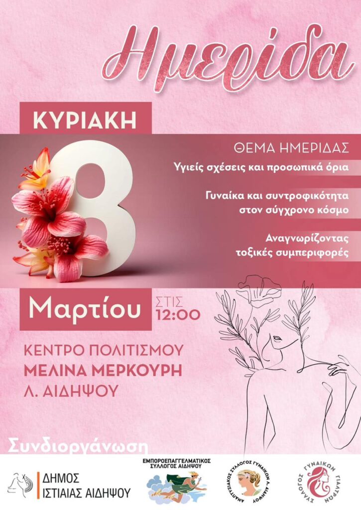 Ο Δήμος Ιστιαίας-Αιδηψού, ο Εμποροεπαγγελματικός Σύλλογος Αιδηψού, ο Αναπτυξιακός Σύλλογος Γυναικών Λ. Αιδηψού και ο Σύλλογος Γυναικών Γιάλτρων, σας προσκαλούν στην ενημερωτική ημερίδα με θέμα τη γυναίκα, τις σύγχρονες σχέσεις και την ενδυνάμωση των προσωπικών ορίων.