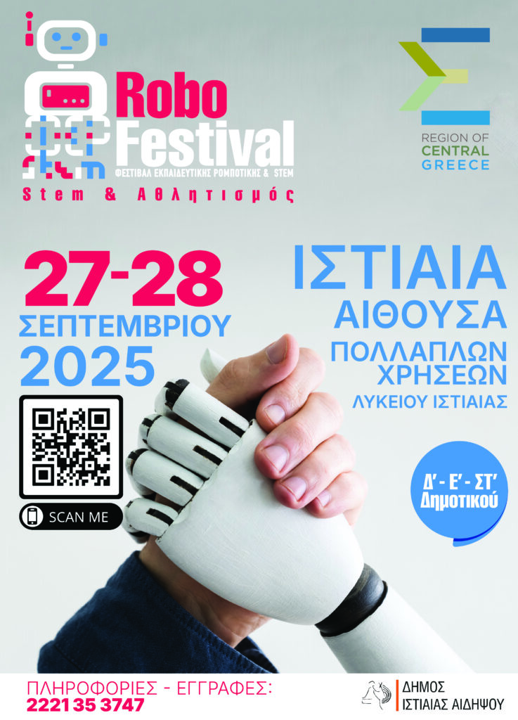 Η Περιφέρεια Στερεάς Ελλάδας διοργανώνει μαζί με το Δήμο Ιστιαίας-Αιδηψού, το 4ο Φεστιβάλ Εκπαιδευτικής Ρομποτικής “RoboFestival STEM | Robotics – Coding – Engineering – Maths”, με κεντρικό θέμα την κατασκευή και τον προγραμματισμό ρομπότ με δομικά στοιχεία LEGO, που θα πραγματοποιηθεί στις 27 και 28 Σεπτεμβρίου 2025, στην Ιστιαία και συγκεκριμένα στην αίθουσα πολλαπλών χρήσεων του Λυκείου Ιστιαίας.