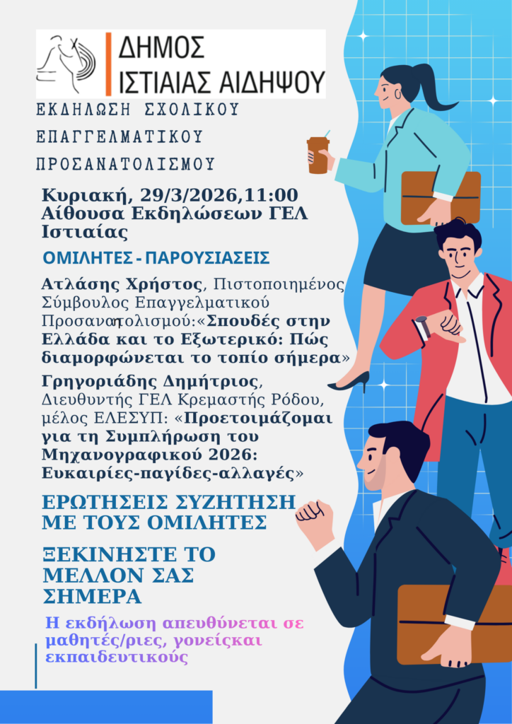 ΔΕΛΤΙΟ ΤΥΠΟΥ_Εκδήλωση Σχολικού Επαγγελματικού Προσανατολισμού_Κυριακή 29.03.2026 23 Μαρτίου 2026 Νέα ΔΤ εκδήλωση επαγγελματικού προσανατολισμού_Ιστιαία 29-03-2026 Μοιρασέ το Tweet Share Plus one Pin It Διαβάστε επίσης ΔΙΕΥΘΥΝΣΗ ΑΓΡΟΤΙΚΗΣ ΟΙΚΟΝΟΜΙΑΣ ΠΕΡΙΦΕΡΕΙΑΚΗΣ ΕΝΟΤΗΤΑΣ ΕΥΒΟΙΑΣ: ΕΜΦΑΝΙΣΗ ΕΠΙΒΛΑΒΟΥΣ ΓΙΑ ΤΙΣ ΚΑΛΛΙΕΡΓΕΙΕΣ ΕΝΤΟΜΟΥ ΓΝΩΣΤΟΠΟΙΗΣΗ για την πλήρωση μιας (1) θέσης Eιδικού Συνεργάτη Δημάρχου στα θέματα Τουρισμού, Πολιτισμού και Αθλητισμού ΓΝΩΣΤΟΠΟΙΗΣΗ Για την πλήρωση μιας (1) θέσης Eιδικού Συνεργάτη Δημάρχου στα θέματα Τουρισμού, Πολιτισμού και… ΠΡΟΣΚΛΗΣΗ ΓΙΑ ΚΑΤΑΣΚΕΥΗ ΔΕΞΑΜΕΝΗΣ ΑΝΑΛΥΤΙΚΑ ΕΔΩ ΠΡΟΣΚΛΗΣΗ ΓΙΑ ΔΕΞΑΜΕΝΗ.